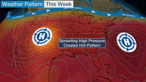 In this case, the heat dome has expanded from the Southwest into the Plains. At the same time, another hot dome of high pressure will build across the western Atlantic into the eastern states.